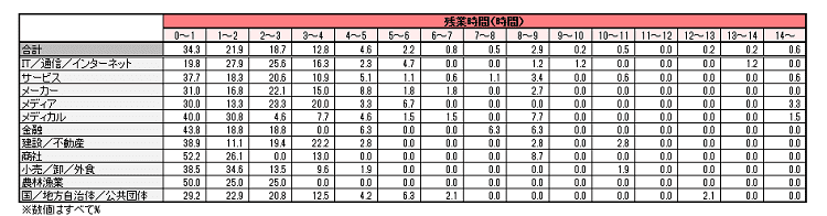 「IT/通信/インターネット」以外は、すべて0時間以上1時間未満が一番多いという結果に。また、「メディカル」「金融」「商社」は、8時間以上9時間未満にも一定の割合の人がいるようです。